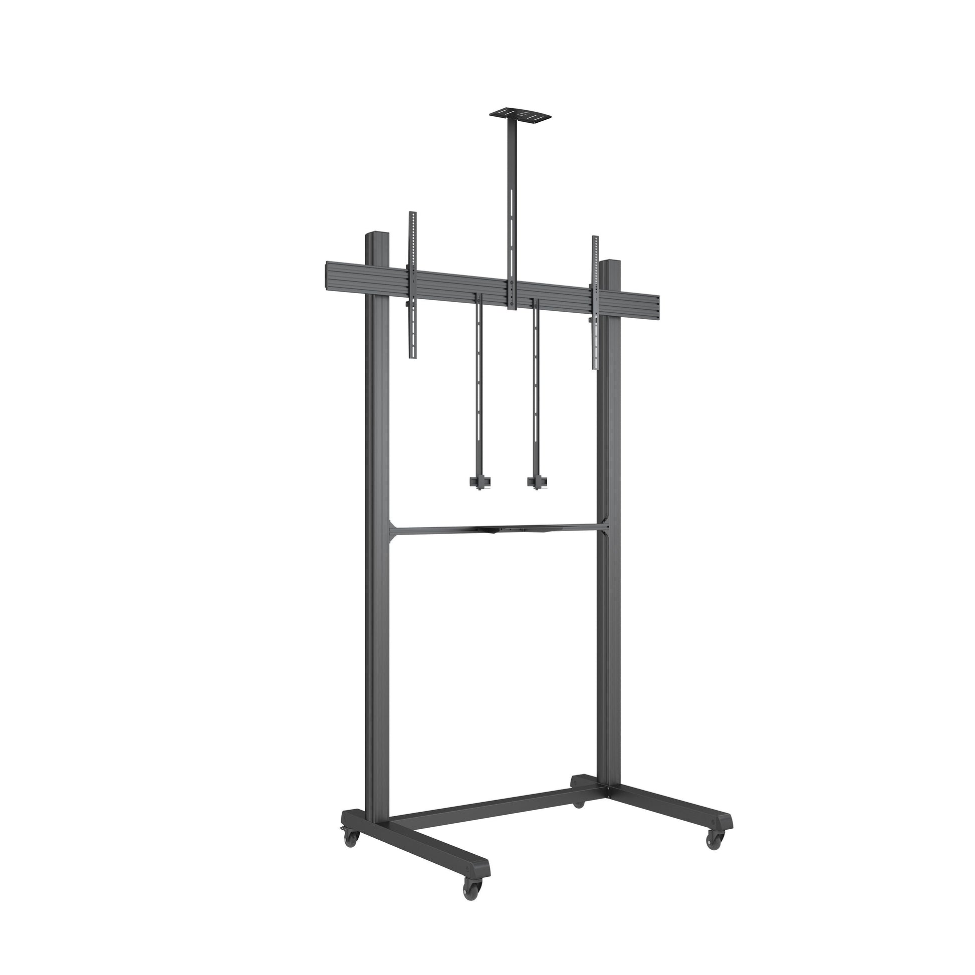 Based on 270cm high pillar made out of durable aluminum, the possibilities for height adjustments are very good and it is possible to provide perfect viewing angle for both a sitting and a standing audience. This movable video wall solution creates a solution that can be used for presentations, trade shows, store or office entrances.